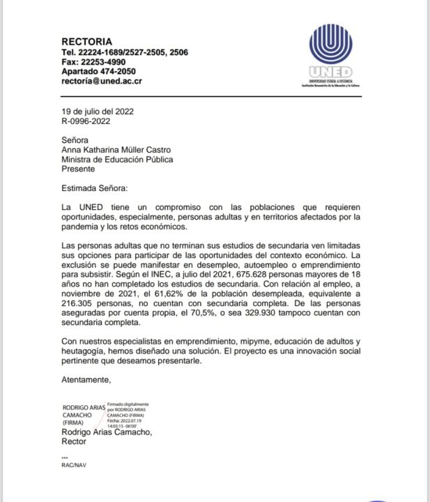 Este alto compromiso de la UNED continúa dando frutos. Es así como, en el 2022, mediante un oficio enviado en julio de ese año a la exministra Anna Katharina Müller Castro, el rector de la UNED, Rodrigo Arias Camacho, le ofrece, “una solución diseñada por especialistas en emprendimiento, mipyme, educación de adultos y heutagogía”. Que en el 2023 se materializa en un innovador proyecto que ahora todos conocemos como Bachillerato para la Empleabilidad y el Emprendimiento, y que familiarmente se le llama BEE.